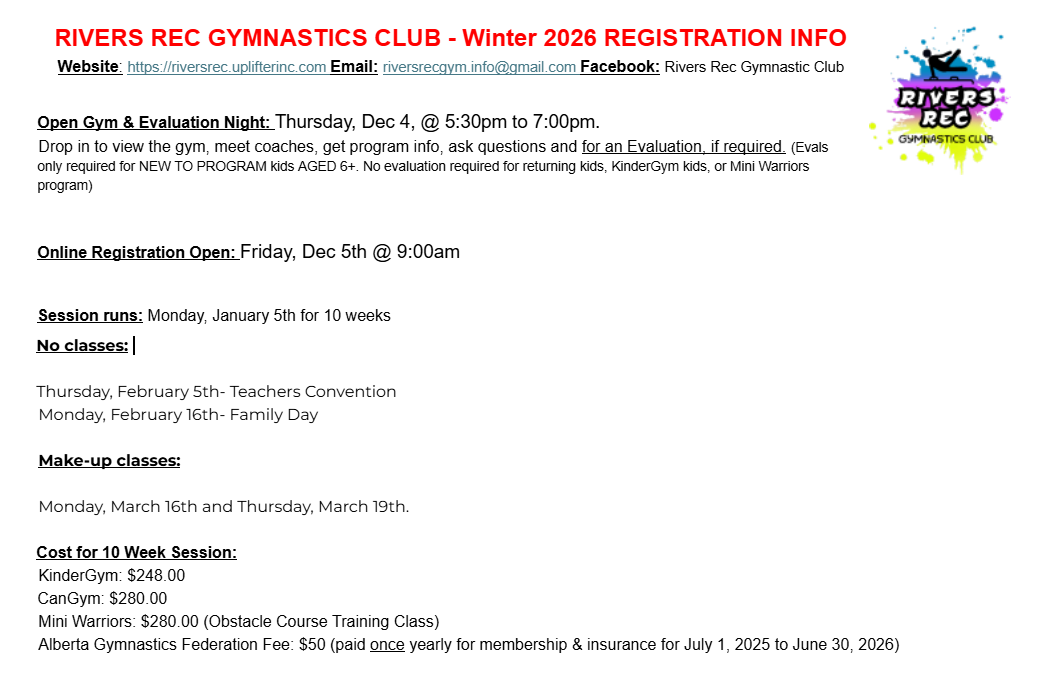 Etransfer email for payments: riversrecgym.pmts@gmail.com